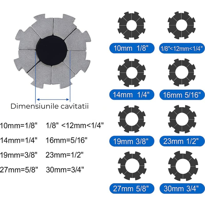 Set complet de bacuri interschimbabile: compatibil cu diferite diametre de furtunuri.