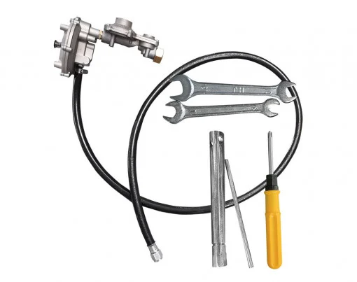 2. Furtunul este echipat cu un reductor care este montat la butelie pentru a crește fiabilitatea conductei de gaz. Astfel se reduce presiunea și se elimină posibilitatea supraîncărcării racordului la gaz.