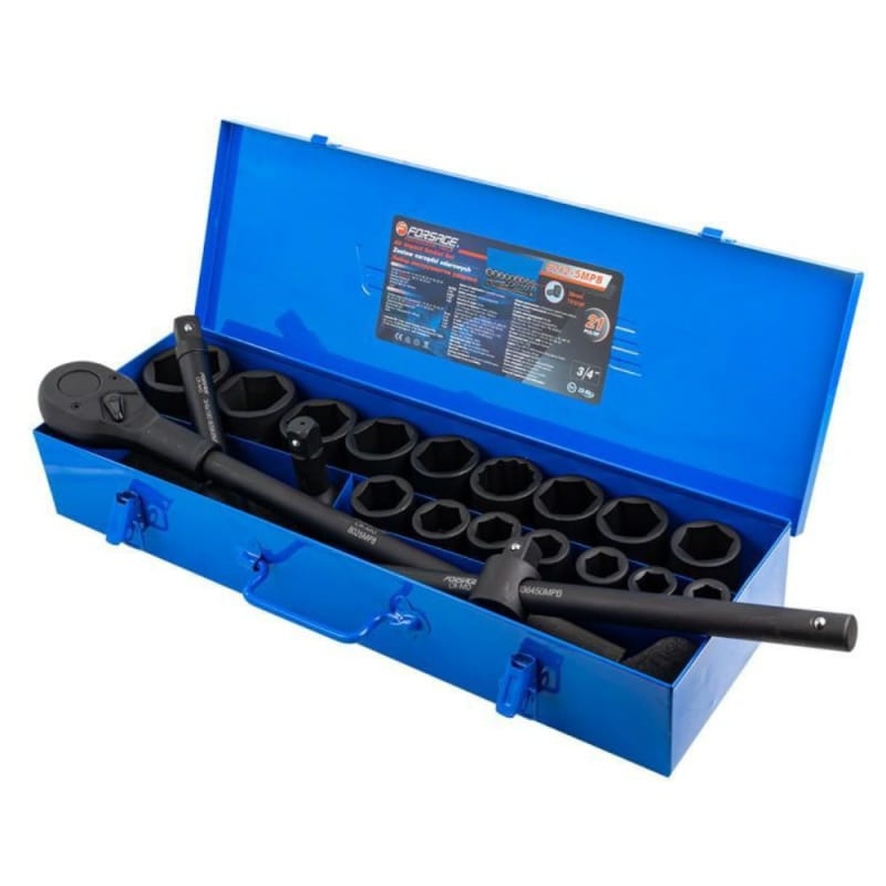 Trusa de chei tubulare de impact, cu pătrat de acționare de 3/4”, este destinată utilizării profesionale în domenii precum reparații auto, industrie grea, construcții și mentenanță.