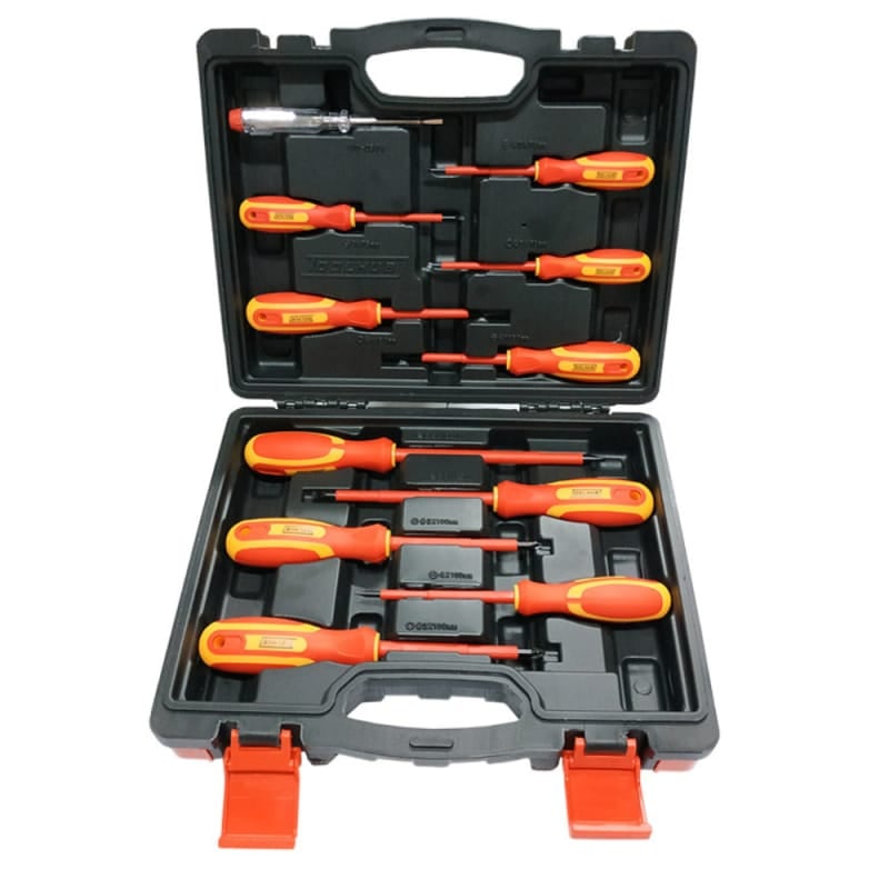 Trusa profesională de șurubelnițe izolate VDE conține 11 piese concepute pentru lucrări electrice și electronice, asigurând protecție împotriva șocurilor electrice până la 1000 V.
